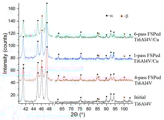 The XRD patterns of the samples obtained on as-received Ti6Al4V, FSPed Ti6Al4V, and Ti6Al4V/Cu were characterized by a set of XRD peaks corresponding to α-Ti (hcp) and β-Ti (bcc) phases (Figure 4). No clear peaks indicating the presence of intermetallic TixCuy phases were detected because they were strongly shielded by the matrix alloy.