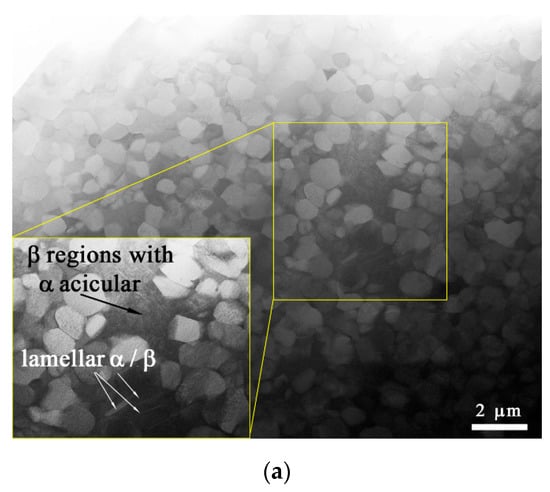 The microstructure of the as-received Ti6Al4V metal was represented by both α- Ti and β-Ti grains (Figure 5a). The mean size of these α-grains was about 4.5 ± 0.28 μm. More β-Ti grains were found in the stir zone of Ti6Al4V after four-pass FSP (Figure 5b,c). The microstructures found in the top and middle parts of the SZ differed from each other such that the top part was composed of α-Ti and β-Ti grains, with fine recrystallized grains located inside them (Figure 5b). The middle SZ part was represented by a higher amount of β-Ti grains as compared to that of the α-Ti grains. Some grain refining was also observed in this middle SZ part such that the mean grain size here was about 1.3 ± 0.08 μm, as detected from corresponding TEM images. The temperature profiles in Figure 2d show that temperatures on the surface of the four-pass FSP track on Ti6Al4V were about 900–990 °C, i.e., close to the β-transus temperature. Inside the SZ, the temperatures might have been even higher to cause the α + β → β transformation and, thus, increase the amount of β grains after cooling.