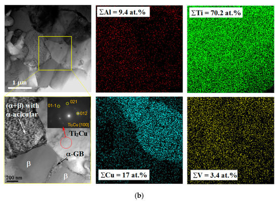 TEM images obtained from the SZ of FSPed Ti6Al4V/Cu supported the data obtained from the SEM. The top SZ1 was composed of fine equiaxed α-Ti and β-Ti grains, as well as β-Ti with acicular and laminar α-Ti grains (Figure 7a). Along with the above-named grains, there were fine-grain boundary α-Ti laths (α-GB) and Ti2Cu IMCs (Figure 7b).