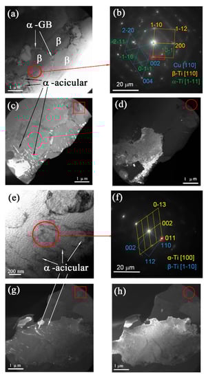 TEM bright- (a,e) and dark-field (c,d,g,h) images and SAED patterns (b,f) of the middle SZ2 part microstructures. Dark-field images (c,d) were obtained using reflections (10-1)α and (-110)β, respectively. Dark-field images (g,h) were obtained using reflections (011)α and (110)β, respectively.