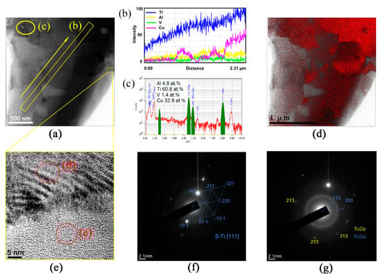 The microstructures shown in Figure 11a and the copper atom distribution in Figure 11d display several copper-rich β grains neighboring those with lower copper content. A small fragment inside the yellow box in Figure 11a contained a β grain boundary whose high-resolution TEM image is represented in Figure 11e and allowed for observing modulated structures in the upper grain (Figure 11e) with a directly resolved crystalline lattice (Figure 11f) and a nearly amorphous grain below the boundary (Figure 11e) with a diffuse scattering halo in the SAED pattern (Figure 11g). This halo contained some fine reflection spots that could be related to those of β-Ti or Ti2Cu.