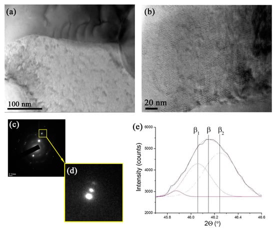 Microstructures of grains with modulated structures formed according to the spinodal decomposition (a,b). A SAED pattern (c) with an enlarged view of the (–202) β-Ti reflection (d) and deconvolution of an XRD (110)β peak. β1 and β2 are Ti phases that emerge from β by spinodal decomposition.