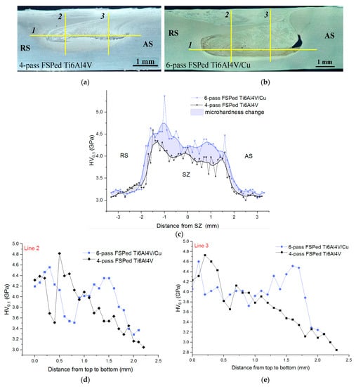 Microhardness profiles were obtained by indenting the four-pass and six-pass FSPed stirring zones of Ti6Al4V and Ti6Al4V/Cu along the lines shown in Figure 13a,b, respectively. Both stirring zones possessed microhardness levels that were higher than those obtained from the peripheral TMAZ/HAZ and the microhardness of six-pass FSPed Ti6Al4V/Cu SZ was higher by about 10% than that of four-pass Ti6Al4V (Figure 13c).