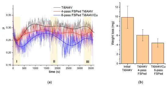 The results of the sliding friction tests in Figure 16 allowed for observing that the Ti6Al4V/Cu samples possessed the lowest mean coefficient of friction (CoF) as compared to either the as-received or four-pass FSPed Ti6Al4V samples. A short running-in stage was observed at the beginning of the sliding when the CoF was reduced for all samples to achieve its minimum at ~250 s. The next stage was characterized by a wide peak from about 500 to 2500 s and two shorter peaks in the 2500–3000 s and 3000–3500 s ranges, respectively. Large CoF oscillations were observed when sliding that may have been related to forming strong adhesion junctions between the counterbodies. The lower CoF values corresponded to those of weight loss during sliding (Figure 16b) such that the Ti6Al4V/Cu was found to be more wear resistant as compared to others.