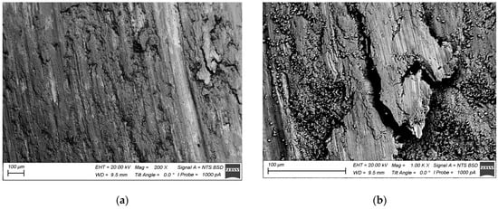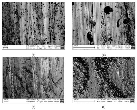 According to Figure 18a,b, the worn surface of the as-received Ti6Al4V was represented by large areas with sliding grooves and those filled with wear debris. Intense plastic deformation and adhesion during sliding resulted in the seizure and removal of large wear particles. It was also expected that these areas became oxidized. In contrast, the worn surface of the four-pass Ti6Al4V showed less adhesion wear but instead looked like it was subjected to microcutting by some abrasive particles (Figure 18c,d). On the six-pass Ti6Al4V/Cu sample, one can again see the rubbed areas with grooves and those filled with wear debris (Figure 18e,f).