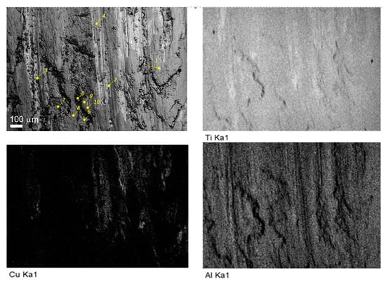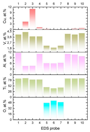 The alloy element distribution on the worn surface of the six-pass Ti6Al4V/Cu showed the presence of copper-enriched areas (probes 2 and 3 in Figure 19 and Figure 20), oxygen-rich areas (probes 5, 6, and 7 in Figure 19 and Figure 20), and smooth areas with their chemical composition almost identical to the base Ti6Al4V alloy (probes 1, 8, 9, and 10 in Figure 19 and Figure 20). The maximum copper content was up to 11 at.% (Figure 19, probe 3). These areas almost coincided with those enriched by titanium; however, the concentration of titanium atoms in these areas was >80 at.%, i.e., the Ti/Cu concentration ratio was much higher than that of Ti2Cu. The reason for this may have been that the intermetallic particles that formed were very fine and dispersed in the alloy. These copper-rich areas coincided with deep wear grooves, while the wear debris-filled grooves contained the maximum amount of oxygen and less titanium and aluminum, and were plausibly titanium and aluminum oxides. Areas 1, 8, 9, and 10 in Figure 19, whose chemical compositions were close to that of the as-received alloy, appeared to have rather thick transfer layer patches that formed on the real contact areas during sliding.