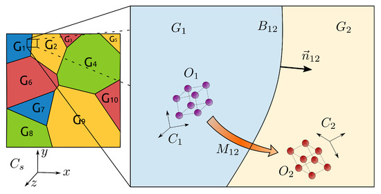 where is the unitary matrix, is the tangential projection tensor, is the surface gradient, and is the curvature tensor. The term is a tensorial diffusion term known as GB stiffness tensor [67,68]. The term in Equation (6) should be null in the grain interfaces. However, the front-capturing nature of the LS approach, which involves solving Equation (2) at the GB network and in its vicinity, requires considering this term, which could be non-null around the interfaces. Then, this stabilization term is totally correlated to the front-capturing nature of the LS approach. The term is the subject of recent studies for twin boundaries (TBs) , , , and [67,69]. In the present work, the torque term is neglected, but the GB energy still depends on the GB misorientation and inclination, and the kinetic equation could be simplified as: