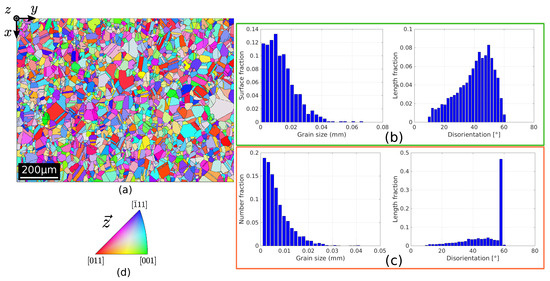 The microstructure used in this section, described in Figure 13, was generated using the same domain with mm and the GSD shown in Figure 7b. The initial number of grains is and their orientation is also generated randomly from the EBSD orientations. The initial number of grains is more important comparatively to the previous test case as the GSD described in Figure 2c, (left side) where TBs are taken into account is used to generate the Laguerre–Voronoï polycrystal.