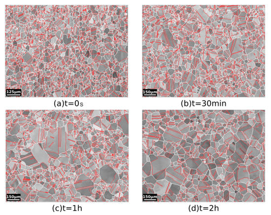 Annealing at 1050 °C: band contrast map of the microstructure of 316L steel at (a) = 0 s, (b) = 30 min, (c) = 1 h, and (d) = 2 h. Grain boundaries are depicted in white and TBs are predicted in red.