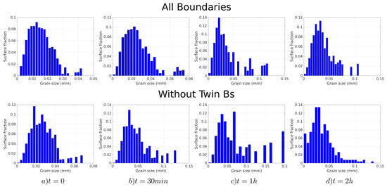 From left to right: evolution of the grain size histograms (in surface) at = 0 s, = 30 min, = 1 h, and = 2 h. (Top): All boundaries are considered. (Bottom): twin boundaries are excluded.