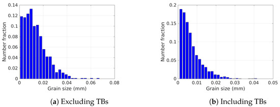 Initial grain size distributions (a) excluding TBs and (b) all grain boundaries obtained from the initial EBSD map shown in Figure 2.