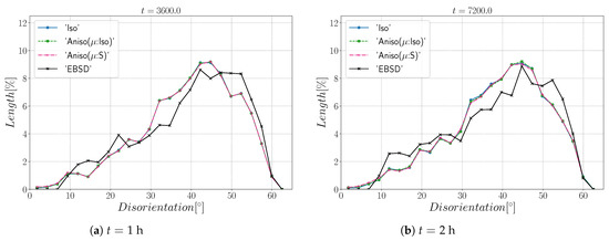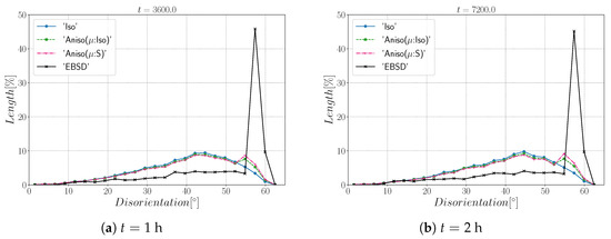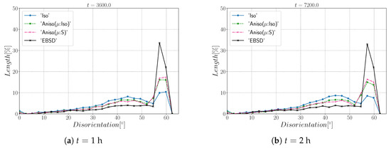 Disorientation distribution obtained including TBs at (a) = 1 h and (b) = 2 h for the isotropic (Iso) formulation, anisotropic formulations with isotropic GB mobility (Aniso(:Iso)) and heterogeneous GB mobility (Aniso(:S)), and the experimental data (EBSD). The y-axis represents the GB length percentage.