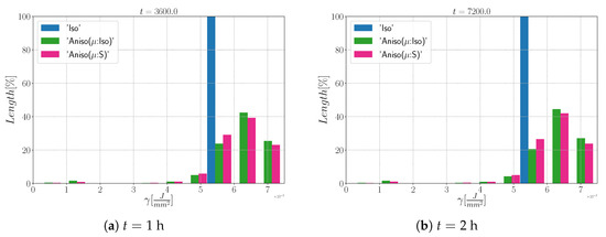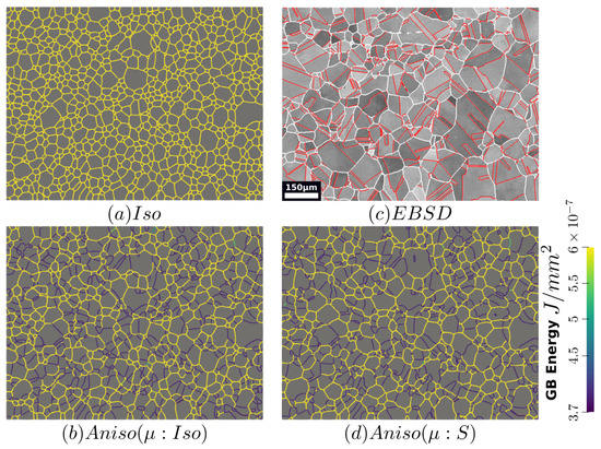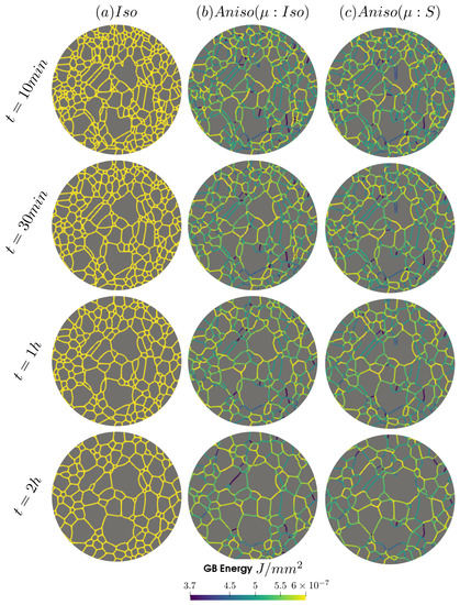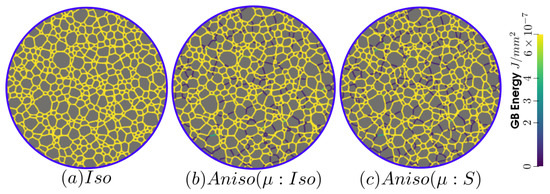 The GB energy of the microstructure at h is shown in Figure 17, a higher number of blue GBs, which correspond to TBs (low value of ), are obtained using the anisotropic formulations, and the effect of heterogeneous GB mobility seems negligible.