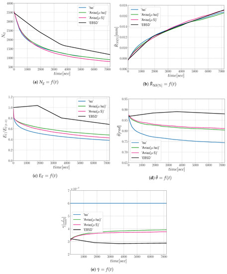 Mean values time evolution for the isotropic (Iso) formulation, anisotropic formulations with isotropic GB mobility (Aniso(:Iso)) and heterogeneous GB mobility (Aniso(:S)), and the experimental data (EBSD). Numerical results obtained from the initial microstructure shown in Figure 13a.