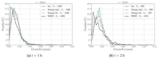 Grain size distributions obtained including TBs at (a) = 1 h and (b) = 2 h for the isotropic (Iso) formulation, anisotropic formulations with isotropic GB mobility (Aniso(:Iso)) and heterogeneous GB mobility (Aniso(:S)), and the experimental data (EBSD). refers to the number.