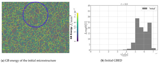 With the immersed data, one can obtain a close digital twin of the real microstructure with the initial GB distributions presented in Figure 20. The initial GB energy distribution (GBED) is shown in Figure 20b. With this particular distribution, several junctions will have a high anisotropy level, and as stated in [22,83], one can expect different behaviors using the different formulations.