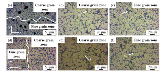 Metallographic morphology of the WAAM-CMT-printed TiB2/AlSi7Mg0.6 sample in face XOY and XOZ: (a) face XOY; (b) coarse grain zone in (a); (c) fine grain zone in (a); (d) face XOZ; (e) coarse grain zone in (d); (f) fine grain zone in (d).