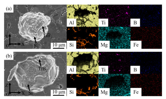 For farther analysis of the microstructure of printed TiB2/AlSi7Mg0.6 composites in two faces (Figure 5), it could be seen that most parts of Si particles were distributed along the α-Al grain boundary and some TiB2 particles segregated at the grain boundary. The size of Si particles was about 3 to 6 µm. Furthermore, there was elements segregation at the grain boundary in printed TiB2/AlSi7Mg0.6 samples, which was a result of the high cooling velocity of the WAAM-CMT printing process. When the cooling velocity of molten pool was high, there would be less time for elements to diffuse sufficiently, finally causing the elements segregation [22,29].
