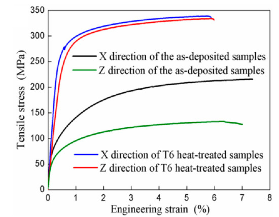 - After T6 heat treatment, there was an obvious increase of yield strength and ultimate tensile strength of the composites in X and Z directions, mainly on account of the precipitation strengthening and solid solution of Si particles.