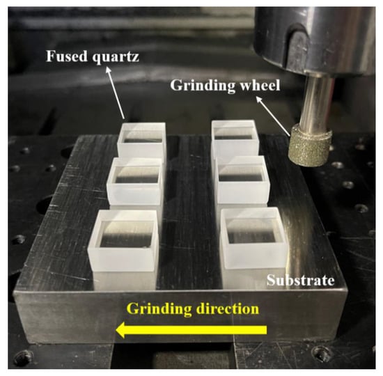 The fused quartz samples used in these tests were 20 mm × 20 mm × 10 mm in size, the SiO2 content reached 99.9% (Shanghai Duopu Optical Materials Co., Ltd., Shanghai, China), and the material properties are listed in Table 1. Before the grinding process, two parallel surfaces were polished to ensure the smoothness and flatness of the sample surface. The surface roughness (Ra) after polishing was about 1 nm, and the surface has no cracks. Two single-layer electroplated diamond wheels (Dongguan Xuqi Hardware Co., Ltd., Dongguan, Guangdong, China) with a size of φ15 × 10 mm and a grit size of #80 were used in the grinding experiment. Grinding wheel A was an undressed wheel, and grinding wheel B was dressed by Inconel 718 (Shenyang Changpu Superhard Precision Tools Co., Ltd., Shenyang, China).