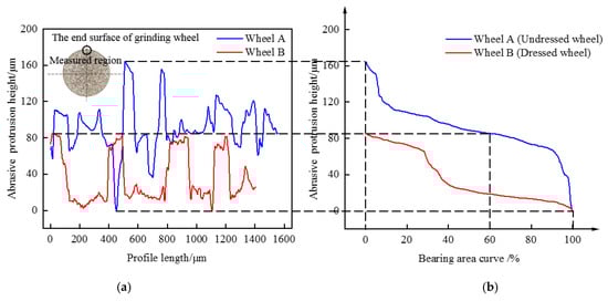 Comparison of abrasive grits morphology of grinding wheel A and B in the peripheral region, the schematic diagram of the end face abrasive grain selection area is shown in (a). (a) Profiles. (b) Bearing area curve based on line profile.