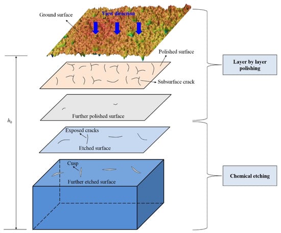 To efficiently detect the large-area crack distribution characteristics at a specific depth, a combined method of layer-by-layer polishing and chemical etching is proposed in this paper. The specific steps are shown in Figure 3.