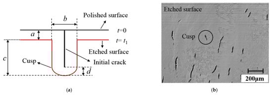 At first, the individual crack was closed before etching. Under chemical action, when the rounded cusp was formed, the subsurface cracks were fully expanded. According to Wong’s research [26], the crack width after corrosion was twice that of the etching depth. This proved that the cracks grew isotropically, and the etching process was a constant velocity corrosion so that the depth of SSD could be obtained. The corrosion model was shown in Figure 4a. In this experiment, the crack morphology after etching was shown in Figure 4b; the average width of more than 20 cracks after corrosion was 16.6 μm, while the average corrosion depth was 7.9 μm. The results proved that the etching process met the requirement of constant corrosion. The combined method provided the distribution characteristics of large-area cracks at different depths without introducing new damage, including information, such as crack morphology, length, depth, and other information.