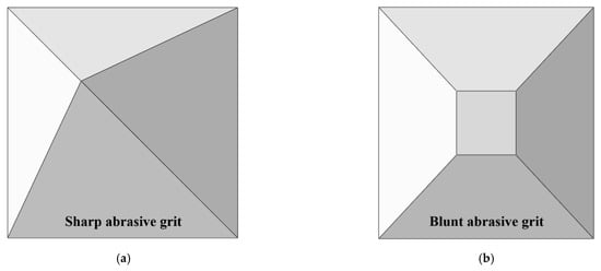 Simulation models of different grits after wear: (a) Sharp abrasive grit, (b) blunt abrasive grit.