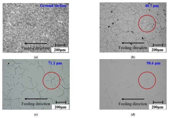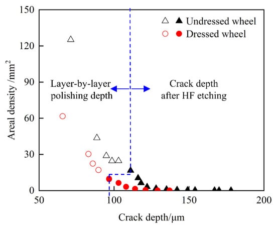 In the actual grinding process, the grinding forces generated by the two grinding wheels were approximately 20 N and 60 N, respectively [35]. From the above theoretical model, the single crack length produced by a spherical grit was about 58 μm. Based on the assumption that the cracks produced under sharp abrasive grains were half-penny cracks, the single crack length and crack depth were approximately equal to 70 μm. In addition, the number of cracks produced by the undressed grinding wheel was greater than that of the dressed grinding wheel under the same measurement area. Therefore, the total crack length per unit area produced by the undressed wheel was greater than that of the dressed wheel.
