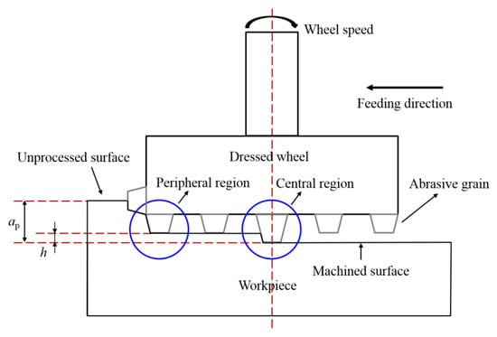The direction of cracks produced by single-point scratching was related to the direction of abrasive grit movement [16,17]. During the actual grinding process, the direction of the end face grinding movement was divided into two parts: one was the direction of movement of abrasive grits at a certain moment, and the other was the direction of feed movement. As displayed in Figure 8f, the subsurface crack direction was almost perpendicular to the feeding direction. To further explain crack directionality, it was necessary to clarify the morphology and protrusion height of abrasive grits. The shape of grits directly affected the type of cracks. The protruding height of abrasive grits determined which grits dominated the material removal process. A comparison of the protruding height of abrasive grits in different regions of the dressed wheel was shown in Figure 9. The protruding height of abrasive grits in the peripheral region was significantly smaller than that in the central region (the maximum height difference was approximately 50 μm). This was because the abrasive grits worn in the peripheral region were more serious than those in the central region. Although the abrasive grits at the peripheral region first acted on the surface of the specimen, the protrusion height of the abrasive grits at the central region was higher, which further removed the material and produced deeper cracks, as shown in Figure 10. The cutting direction of the abrasive grits in the central region was consistent with the feeding direction, and thus the crack direction was approximately perpendicular to the feed direction. For the undressed grinding wheel, the grit protruding height was random, and the movement speed was different at different positions; therefore, the direction of the generated cracks was without obvious directionality.