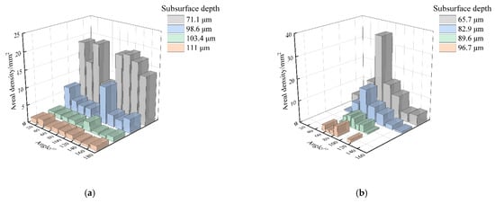 Furthermore, the slope of each crack was obtained by linear fitting and then the inclination angle was calculated and the statistical results were shown in Figure 12. Since the cracks had bifurcations, they need to be calculated separately, and the range was set to 0°–180° to reflect the difference in directionality. It was found that the distribution of crack angles shown in Figure 12a had no preferred direction at any depth. Differently, as shown in Figure 12b, 71.6% of the cracks inclined between 50° and 90°. With the gradual increase in subsurface depth, some shallow cracks were removed and the crack directionality became increasingly clear. Finally, the cracks in the range of 50° to 90° from the cutting direction accounted for 88.9% at a depth of 96.7 μm. Considering the grit morphology and protruding height, the dressed wheel was mainly dominated by grits in the central area of the end face, which produced deep cracks (as shown in Figure 9 and Figure 10). The cutting direction of these grits was approximately the same as the feeding direction. Therefore, most of the cracks produced by these grits had similar angles.
