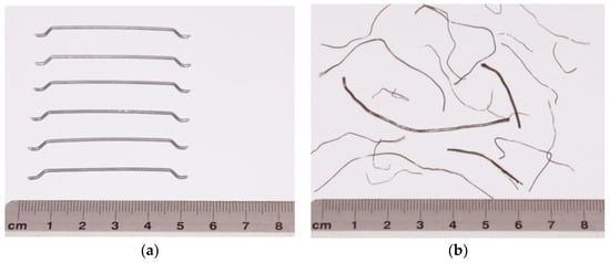 MSFs are used as structural reinforcement for concrete and meet the requirements of the standard [53]. The type of material declared by the manufacturer was SAE 1006: round wire, cold-drawn, bare, with a nominal diameter of 1.0 mm, and made of low-carbon steel (below 0.1% C). RTSFs were obtained by means of the mechanical recycling of tyres and had undergone additional treatment. Additional treatment was based on the use of air, vibration, and magnetic separators, and the final separation of textile remnants took place using negative pressure. After separation, a fraction of rubber granulate and steel cord was obtained. Pictures of RTSFs and MSFs used in this study are shown in Figure 1.