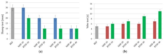 The effect of RTSFs and MSFs on the consistency of the concrete mix: (a) slump test, (b) Vebe test.