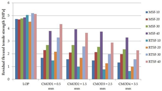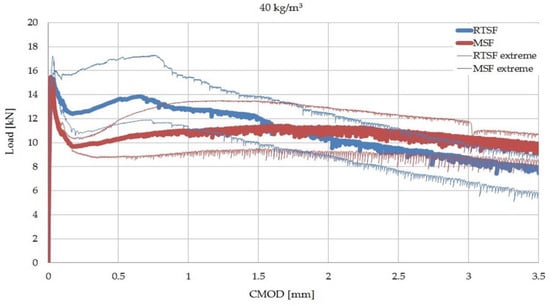 Figure 5 shows the results of the residual flexural tensile strength test for types of concrete containing 10, 20, and 30 kg/m3 of MSFs and RTSFs, while Figure 6 and Figure 7 present the comparison of the load–CMOD curves for examples of concrete samples containing 30 and 40 kg/m3 of the fibres. The data presented in this study are available in the Supplementary Material.