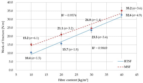 The figure shows that the work of the fracture, i.e., the resistance to brittle fracture, for both concrete with MSFs and concrete with RTSFs increased as the fibre content in the concrete increased; however, this correlation was slightly weaker for MSFs (correlation coefficient R2 = 0.9574) than for RTSFs (R2 = 0.9869). An analysis of the results indicates that at 10 kg/m3 and 20 kg/m3, concrete with MSFs had higher levels of fractures than concrete with RTSFs, by 32 and 28%, respectively. At 30 kg/m3, however, the work of fracture for concrete with MSFs was only 5% higher, while for 40 kg/m3, it was 7% higher than that of concrete with RTSFs. Considering the material’s characteristics, the uncertainty, and the standard deviation, it may be concluded that work of fracture, i.e., the fracture resistance, for both comparable composites with 30 and 40 kg/m3 of fibres was similar. No papers that defined fracture resistance using the measured work of fracture for concrete containing recycled tyre steel fibres were identified as part of the literature analysis.