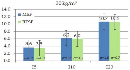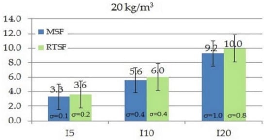 Comparison of fracture toughness indices I5, I10, I20 of concrete with 30 kg/m3 MSFs and RTSFs (σ—standard deviation).