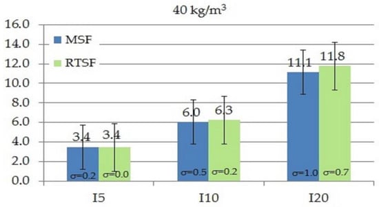 Comparison of fracture toughness indices I5, I10, I20 of concrete with 40 kg/m3 MSFs and RTSFs (σ—standard deviation).