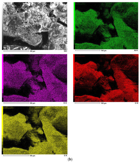 Alum-potassium crystals form agglomerates of irregular shape (Figure 3b). Due to the varied shapes of the particles of this mineral, it is characterized by a heterogeneous structure. These observations have also been described by other authors for potassium aluminum alum [67].