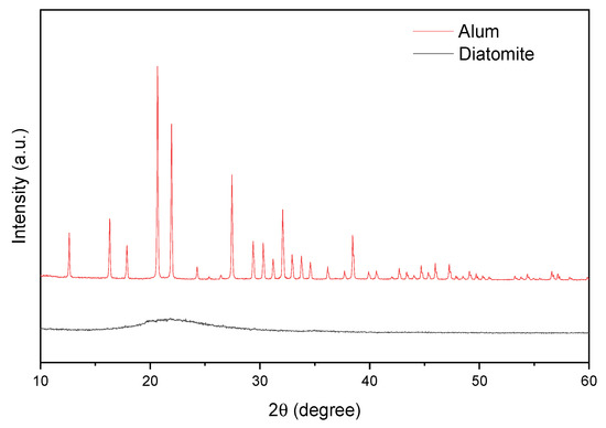 Figure 5 shows the diffractograms of diatomite and alum. The pattern acquired from diatomite was found identical to that of reported in literature [68]. Broad peak located at 22° (2θ) corresponds to amorphous silica and is characteristic of natural diatomite. The XRD alum spectrum is consistent with the literature (JCPDF 07-0017) and is responsible for the potassium alum [67].