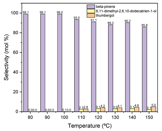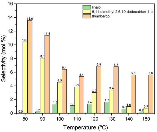 In this case (Figure 9), the obtained products show significantly lower selectivity values in relation to that when the process was carried out in the presence of diatomite. At the initial temperatures of the process, i.e., 80–90 °C, only cyclization (TH) and fragmentation (DC) products are formed: and at these temperatures, the above-mentioned products achieve the highest selectivities: DC about 11 mol% (80 °C) and TH about 14 mol% (80 °C). With increasing the reaction temperature, the selectivity values for these products decrease, and after exceeding 130 °C, DC is transformed into TH, which can be seen in the increase in the selectivity of this product. Moreover, in the range of 100–130 °C, a third product appears-linalool with the selectivity about 2 mol%.