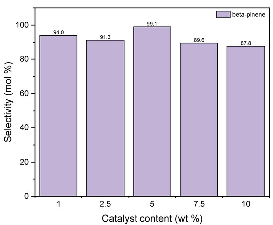 Figure 11 shows the changes of the selectivity of transformation to BP when the process is carried out in the presence of diatomite. It is visible that the maximum of this function is achieved for the catalyst content of 5 wt % and amounts to approximately 99 mol%. After this content is increased, the value of selectivity of transformation to BP decreases to 88 mol%. The high activity of diatomite in the formation of beta-pinene can be explained on the basis of the BET method. Compared to alum, diatomite has a well-developed surface and probably the preference for beta-pinene formation over other products is due to the fact that its formation reaction takes place inside the pores where the active centers of aluminum are present. Therefore, we are dealing here with the shape-selective action of diatomite. In the pores of the diatomite, the geraniol molecule transforms from a linear molecule into a monocyclic one as a result of hydration, which takes place on the active centers of Al. This indicates that the cyclic structure of 10 carbon atoms is more preferable in the pores of the diatomite than linear. Low selectivities for the formation of DC and TH compounds on the diatomite may indicate that these compounds are formed mainly on the catalyst surface and their formation requires an increased content of aluminum centers on the surface, and such a situation occurs in the case of alum, where an increase in the selectivity of formation is observed these two products.