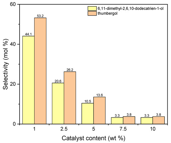 The influence of catalyst content on the selectivities of the appropriate products over diatomite as the catalyst.