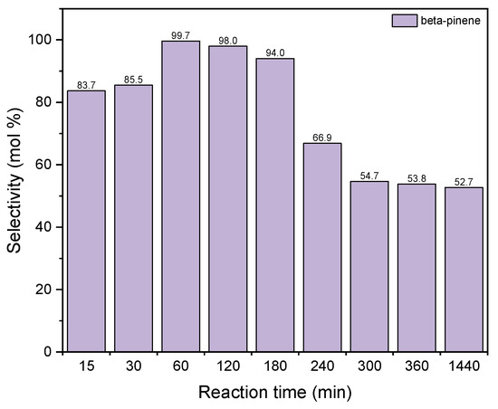 The influence of reaction time on the selectivities of the appropriate product over diatomite as the catalyst.