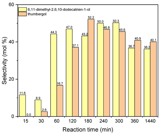 The next figure concerns the studies with aluminium potassium alum and shows the changes in selectivities of DC and TH (Figure 14). The values of selectivities for both compounds increase for the reaction time 180–240 min. For the reaction time 240 min the selectivity of DC is about 50 mol%, and for thumbergol it selectivity amounts 52 mol% for the reaction time 180 min. After the reaction time 180–240 min, the values of selectivity of these two compounds slightly decrease: for DC to about 36 mol% and for TH to about 40 mol%.