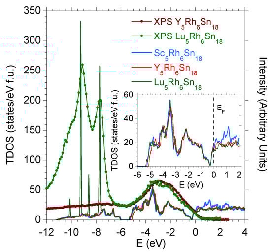 Figure 2 compares the valence band (VB) XPS spectra of YRhSn and LuRhSn with the respective total (T) density of states (DOS). The TDOS for ScRhSn are also shown. The valence band XPS spectra shown in the figure are almost identical and are dominated by Rh d-electronic states. For the Lu-sample, the s, p, and d electronic valence band states are clearly overlapped by the SO -electron states of Lu. Similarly, the calculated valence bands of RhSn have a very similar structure and correlate well with the VB XPS spectra, as shown in Figure 2. The Lu -electron XPS states are well accounted for by the Lu states calculated for eV, which signals that the density-functional theory (DFT) calculations with eV and accompanying eV are correct for obtaining the details in the electronic bands of LuRhSn near the Fermi level () as well as the value of TDOS, , at ( is the total DOS at the Fermi level for one spin direction and is of TDOS( for the paramagnetic system). For the Y- and Sc-compounds, the Rh-d electron correlations with eV were always taken into account in the same way, neglecting the effect of occupation of the f-electron shell.