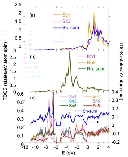 Total DOS per atom (Sc (a), Rh (b), Sn (c)) in ScRhSn.