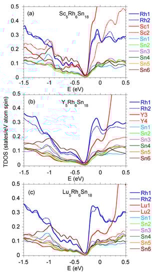 Regarding point (iv), strong hybridisation between the electronic states usually causes their delocalisation. In the case of the bonding of atoms (Sc, Y, Lu) and Sn, one observes the largest distance between them, and similarly, the accompanying charge transfer is the largest (cf. Table 1). These observations, in contrast to the hybridisation effect, justify a greater localisation of electronic states for both the metal R (especially when R = Y and Lu) and Sn. Strong charge transfer is typical of ionic and/or covalent bonds; moreover, the bond extension can also justify the mechanism of localisation due to Mott criteria [29]. For the series of 5:6:18-type compounds, it seems reasonable to explain that the R atom centred in the Sn cage forms strongly hybridised states with an environment, in competition with the localisation effect caused by the size of the cage and charge transfer effect. The formation of tetrahedral coordination of atoms (Figure 1b), typical for materials like Si or Ge, can be associated also with strong hybridisation of the valence states of Rh, Rh, Sc, and Sn, as shown in Figure 4a for an energy range between eV and . Relatively large electronic charge leakage from Sn atoms may also indicate enhanced hybridisation within the tetrahedron complex.