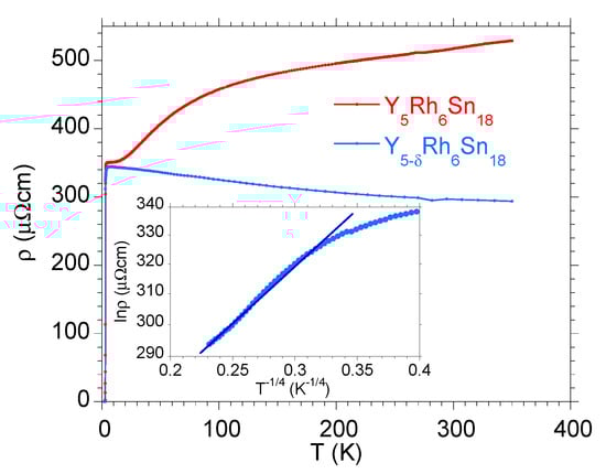 Electrical resistivity for stoichiometric YRhSn (red points) and off-stoichiometric YRhSn (blue points) samples (). Inset displays the resistivity data for YRhSn in coordinates . The linear vs. behaviour is observed between ∼100 K and 350 K.