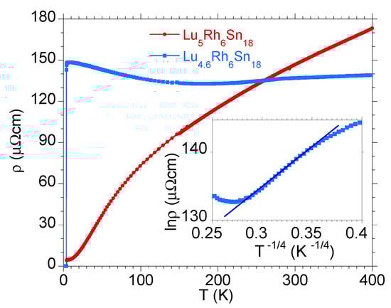 Electrical resistivity for LuRhSn (red points) and LuRhSn (blue points). Inset displays the resistivity data for LuRhSn in coordinates and the linear vs. behaviour between ∼60 K and ∼160 K.