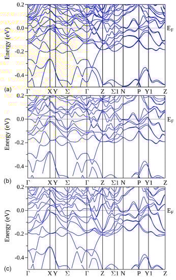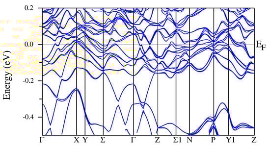 Figure 9 displays the band structure calculated along high-symmetry k lines in the Brillouin zone for stoichiometric YSrRhSn sample. The aim of ab initio calculations was to show that the dopant (Sr) does not modify the band structure in the binding energies between and −0.5 eV, leaving the pseudogap at −0.3 eV. In effect, the resistivity of the Sr-doped sample is expected to be metallic; this is, however, not the case. The EDXS measurements indicated the deficiency of Y in the YSrRhSn sample too, which is a reason for the semimetallic behaviour in data and the Mott’s dependence [17].